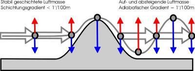 In gleicher Weise verbreitetes Lehrbuchwissen ist es, dass Wellen in der Atmosphäre zu ihrer Entstehung und Ausbreitung einer Umkehrung der eben geschilderten Stabilitätsverhältnisse bedürfen. Damit sie auftreten können, bedarf es einer stabilen Schichtung: aufsteigende Luftpakete kühlen sich mit zunehmender Höhe adiabatisch schneller ab als die umgebende, geschichtete Luftmasse – absteigende erwärmen sich mit abnehmender Höhe umgekehrt entsprechend schneller. Die Folge ist, dass beliebige Luftpakete in der stabilen Schichtung immer wieder in ihre vertikale Ausgangslage zurückkehren, nachdem sie – auf welche Art auch immer – aus dieser ausgelenkt worden sind.